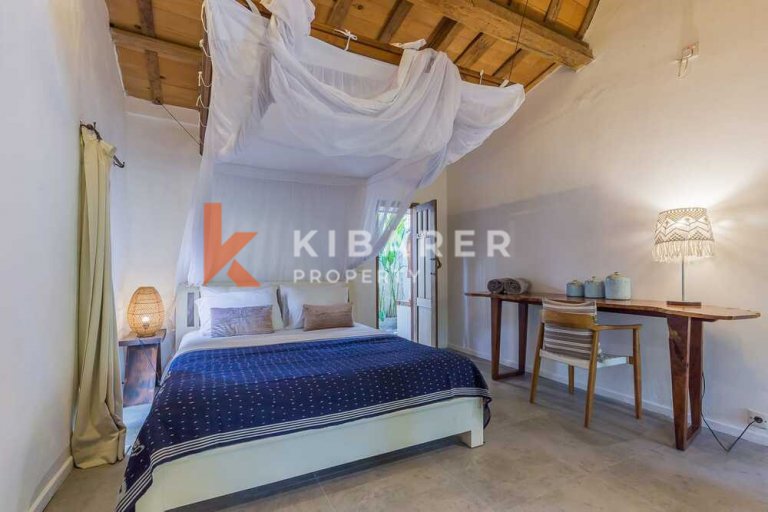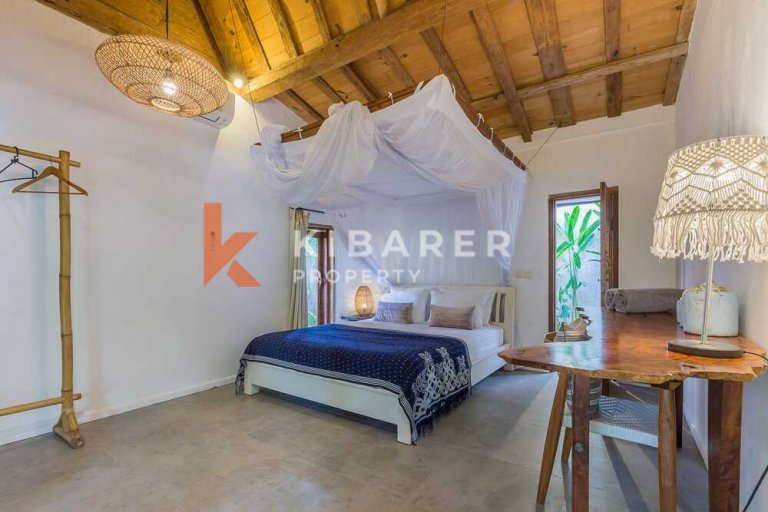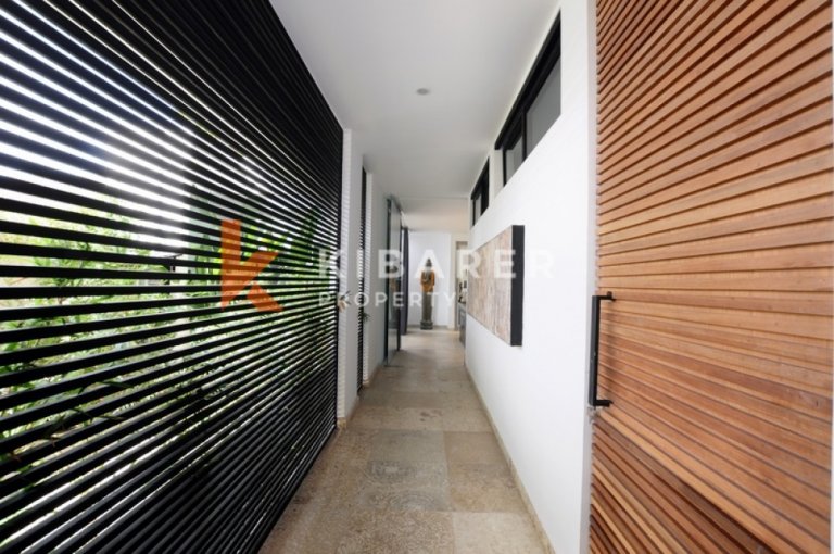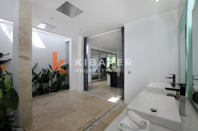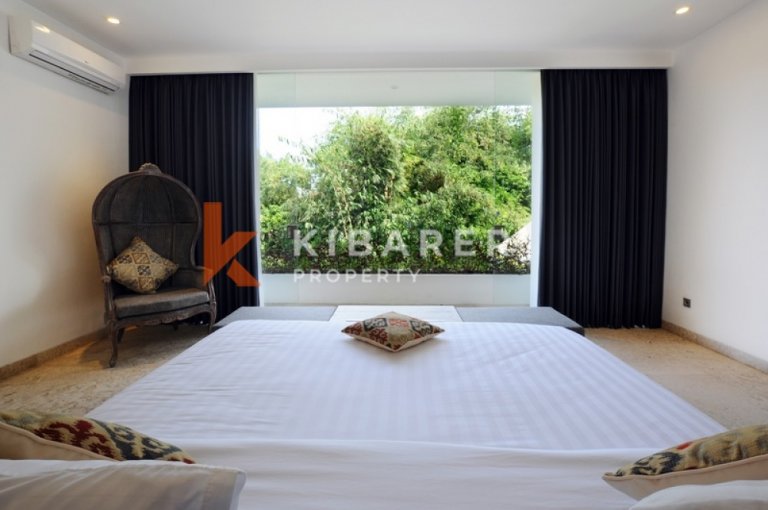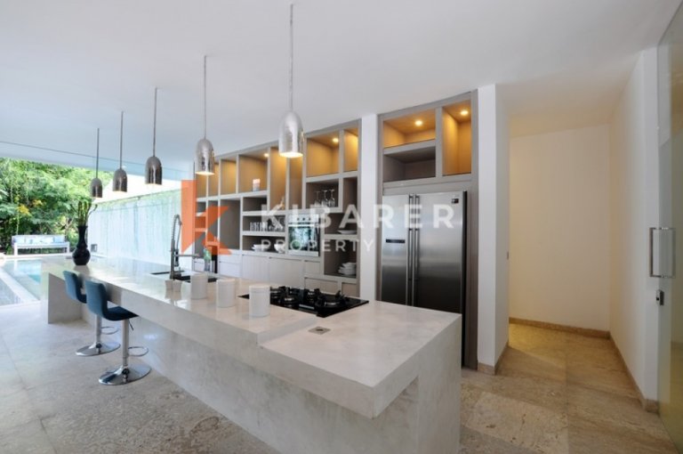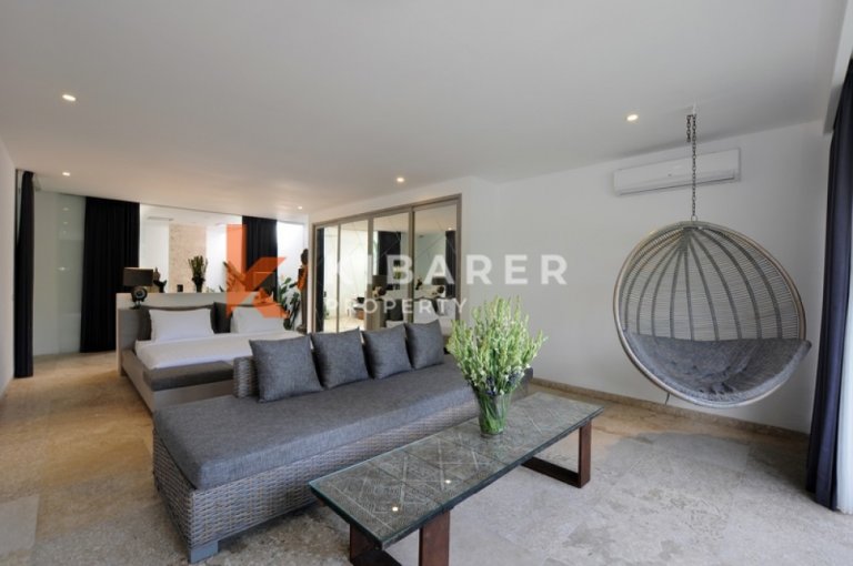 Cette villa offre généreusement quatre chambres avec salles de bains privatives, climatisées et ouvertes soit sur un balcon privé, soit sur l'espace piscine. Les villas offrent des espaces de vie et de salle à manger ouverts avec vue sur la piscine et le jardin qui se lient parfaitement à l'intérieur et à l'extérieur. Le marbre de Carrare, les meubles en teck et les sols en pierre confèrent une texture naturelle et un style décontracté. La collection d'art est un mélange éclectique de tradition balinaise et de modernisme. La villa dispose également d'une cuisine entièrement équipée avec un bar pour vos préparations de déjeuner et de dîner.