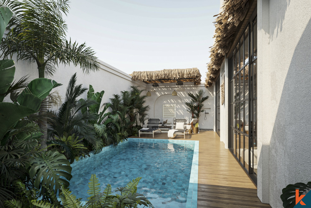 Masuklah ke ruang tamu yang cekung, jantung vila, dengan langit-langit tinggi dan pemandangan kolam renang pribadi yang indah menciptakan suasana megah. Dikelilingi oleh tanaman tropis yang rimbun, area kolam renang, lengkap dengan lounge dan tempat tidur kolam renang, merupakan puncak kemewahan.