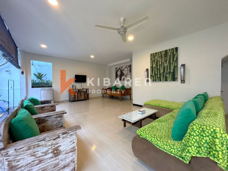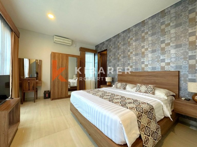Villa cantik ini terletak di kompleks villa di Jimbaran, kawasan aman, tenang dan strategis. Dibangun di atas tanah seluas 2,5 are dengan 3 kamar tidur nyaman dengan kamar mandi dalam. Villa ini memiliki berbagai fasilitas dengan suasana kamar yang bersih dan nyaman. Dua kamar tidur di lantai satu dengan tempat tidur queen, salah satunya memiliki bathtub dengan pancuran di kamar mandi, satu lagi hanya memiliki pancuran di kamar mandi, satu kamar tidur lainnya di lantai dua, memiliki tempat tidur twin yang dilengkapi dengan balkon lengkap dengan meja dan bangku untuk bersantai, kamar mandi juga dilengkapi dengan bathtub dan shower.