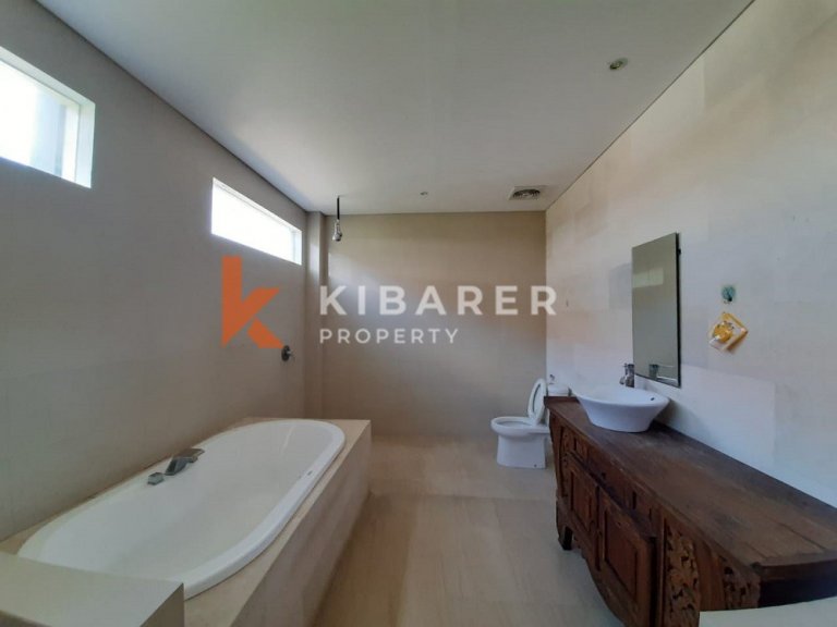 Villa ini memiliki ruang tamu terbuka yang menciptakan aliran yang mulus di seluruh rumah, dilengkapi dengan tiga kamar tidur yang nyaman, masing-masing dengan kamar mandi dalam. Kolam renang berukuran cukup besar terletak di jantung properti, dikelilingi oleh taman tropis yang rapi, menyediakan area luar ruangan yang menyegarkan untuk bersantai.