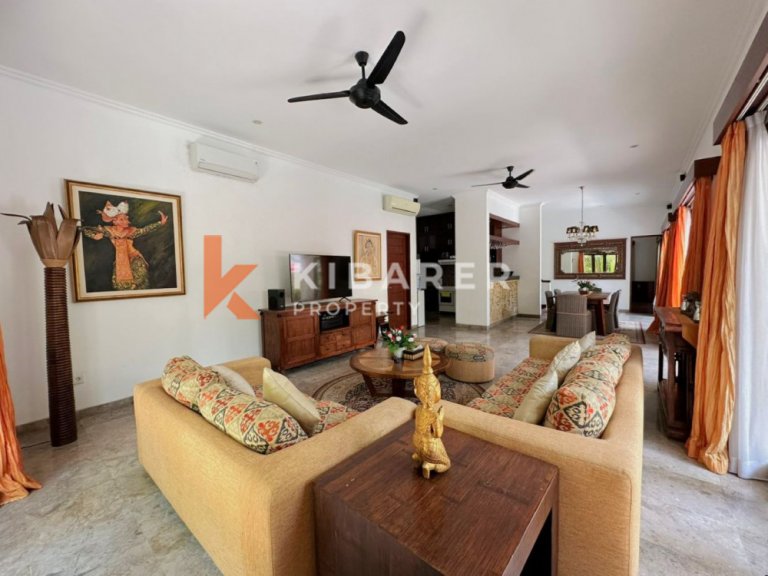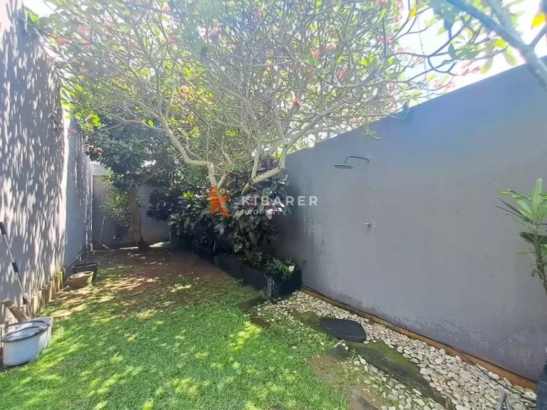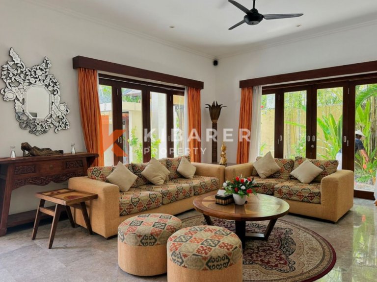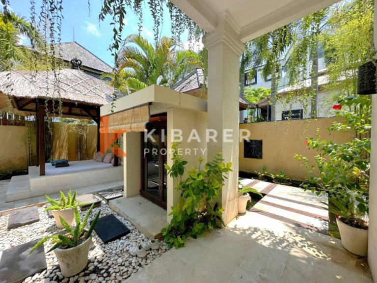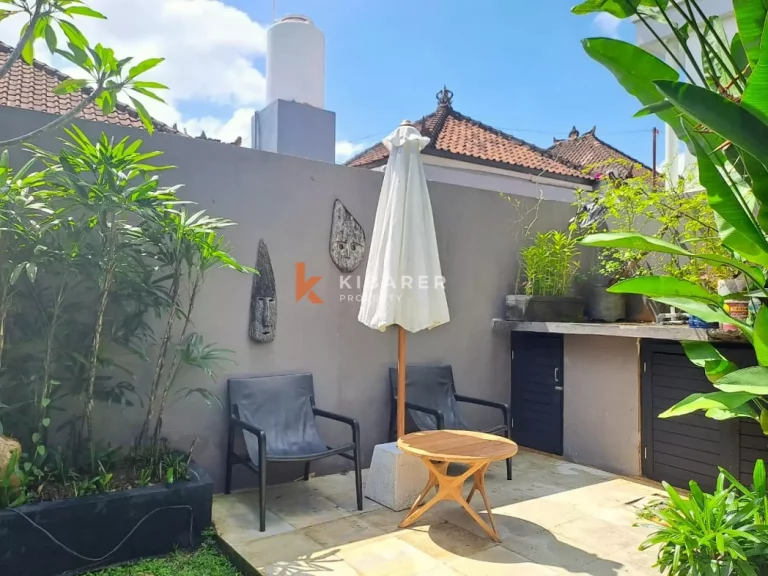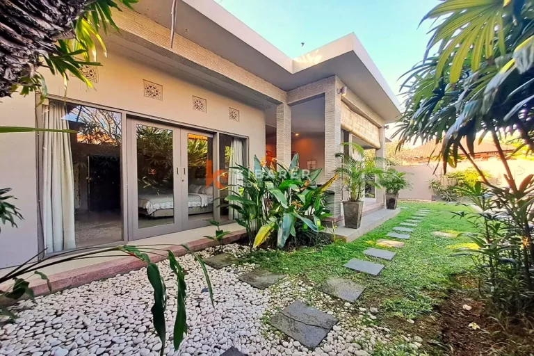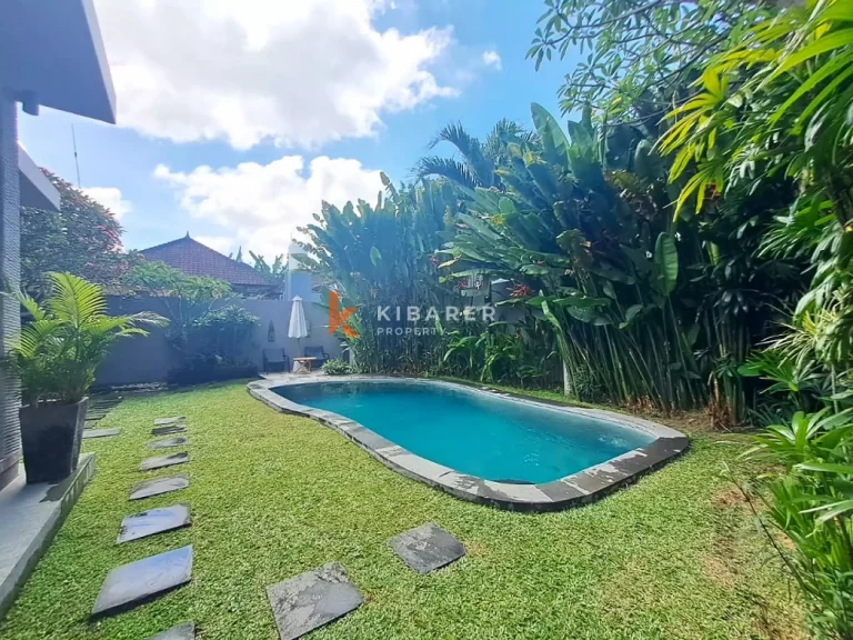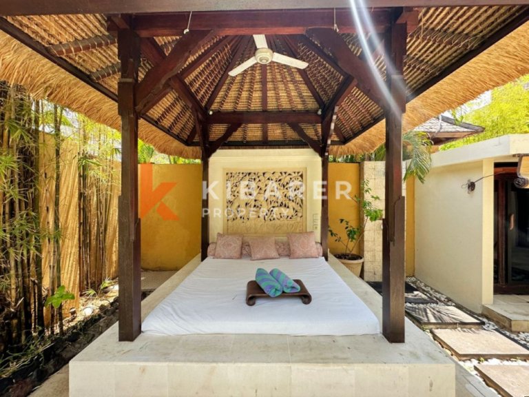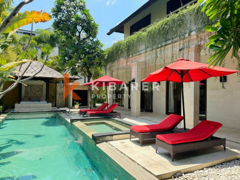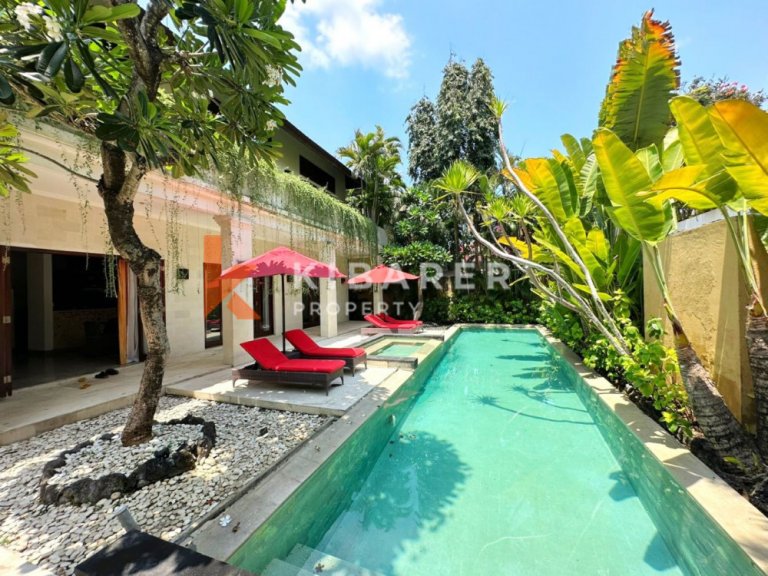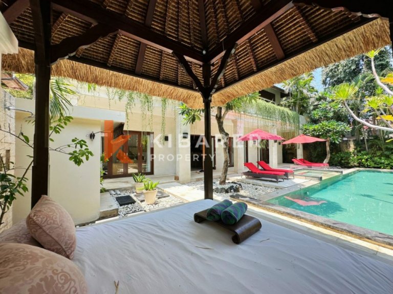 This Property is a modern designed villa with tropical charm . The four bedroom villa is located in a quiet street of bustling Seminyak. The restaurants, cafes, shopping and beaches that this popular village in south Bali has become well known for around the world, are only minutes away. Each air-conditioned room has a private en-suite bathroom with double vanity units and large rain shower heads, completing the Bali tropical villa experience. The Master bedroom also gives guests the chance to enjoy bathing under the sky day or night in a private corner of the indoor/outdoor bathroom . The villa’s contemporary design with landscaped garden pool area with soft sun lounge chairs and outdoor “Bale Bengong” (Balinese outdoor lounge) is ideal for families, groups of friends or couples. This Property gives the option of being either an open-air villa where you can enjoy tropical living, or you can close the wide folding glass doors, creating a seamless indoor/outdoor villa living experience where you can cool down with either fans or air conditioning. Private swimming pool is surrounded by a timber deck and a Bale overlooking the pool for those afternoon naps or just relaxing the day .