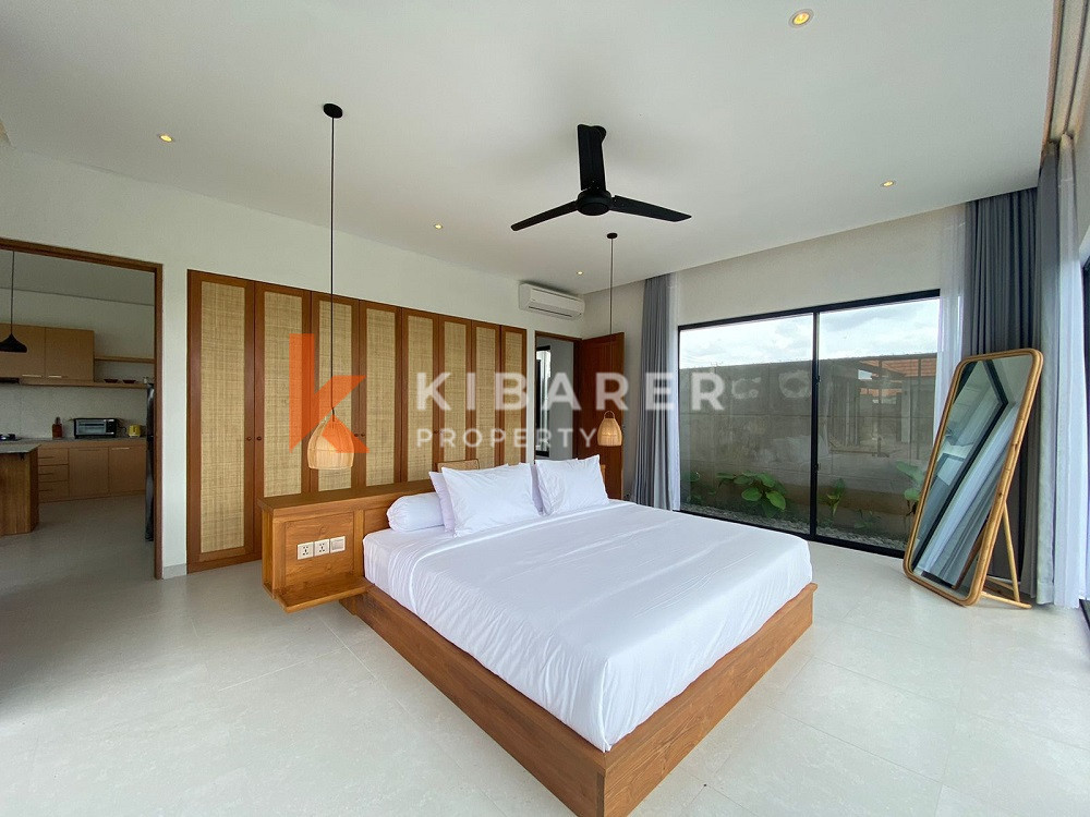 Lovely and amazing riverfront villa is blend of modern and industrial touch, this wood accented Five bedrooms with en-suite bathroom, desks plus smart TVs. It also has a spacious common area with sliding glass doors, an equipped kitchen and lovely high ceilings. There is room for 10 guests with wifi and modem boosters included, a lovely pool facing west for sundowners and parking as well for two cars and two motorbikes. It build on 3 are land with 450 sqm building size. It's fully furnished and situated in the beautiful Pererenan area with River Front view.